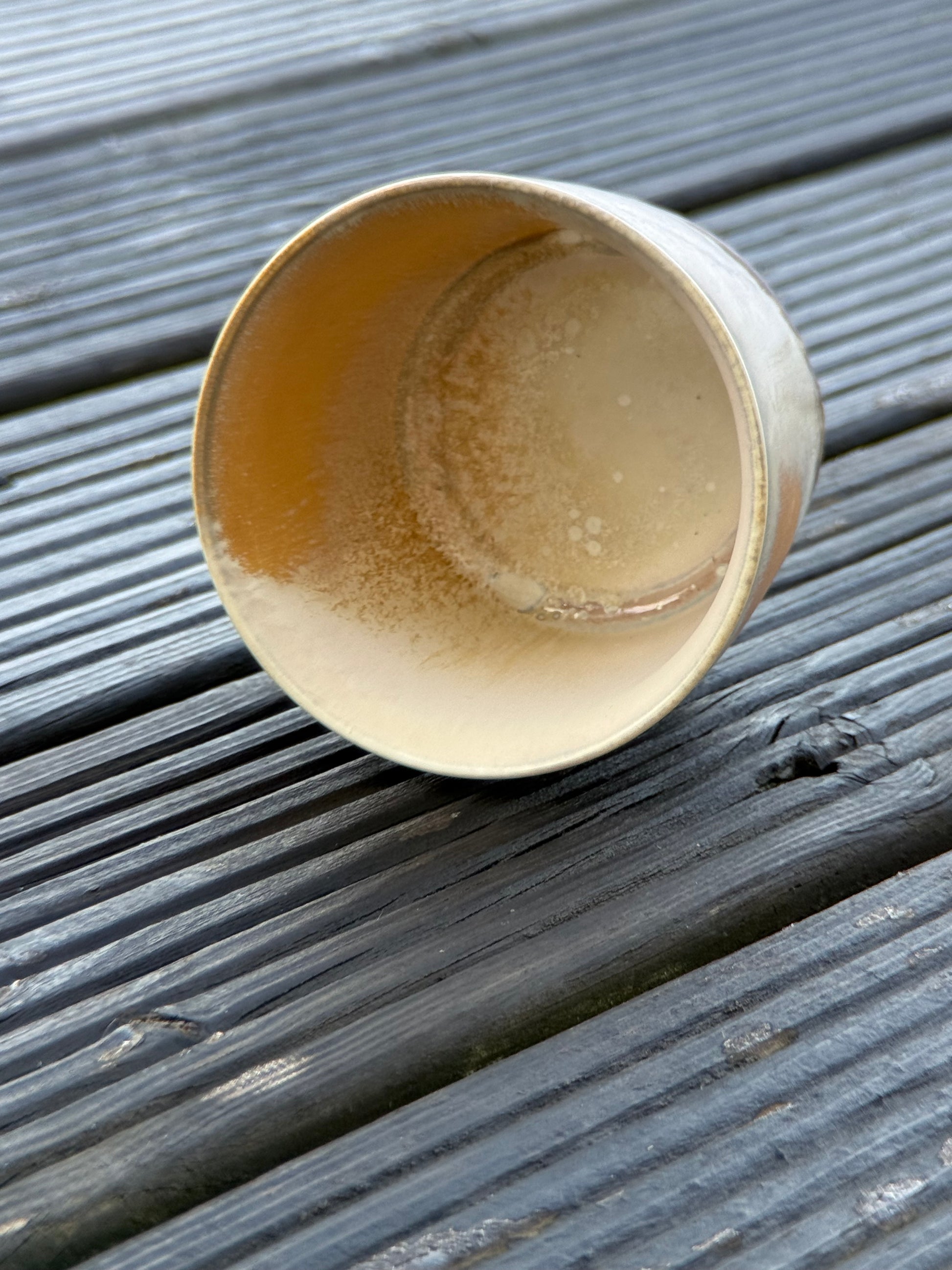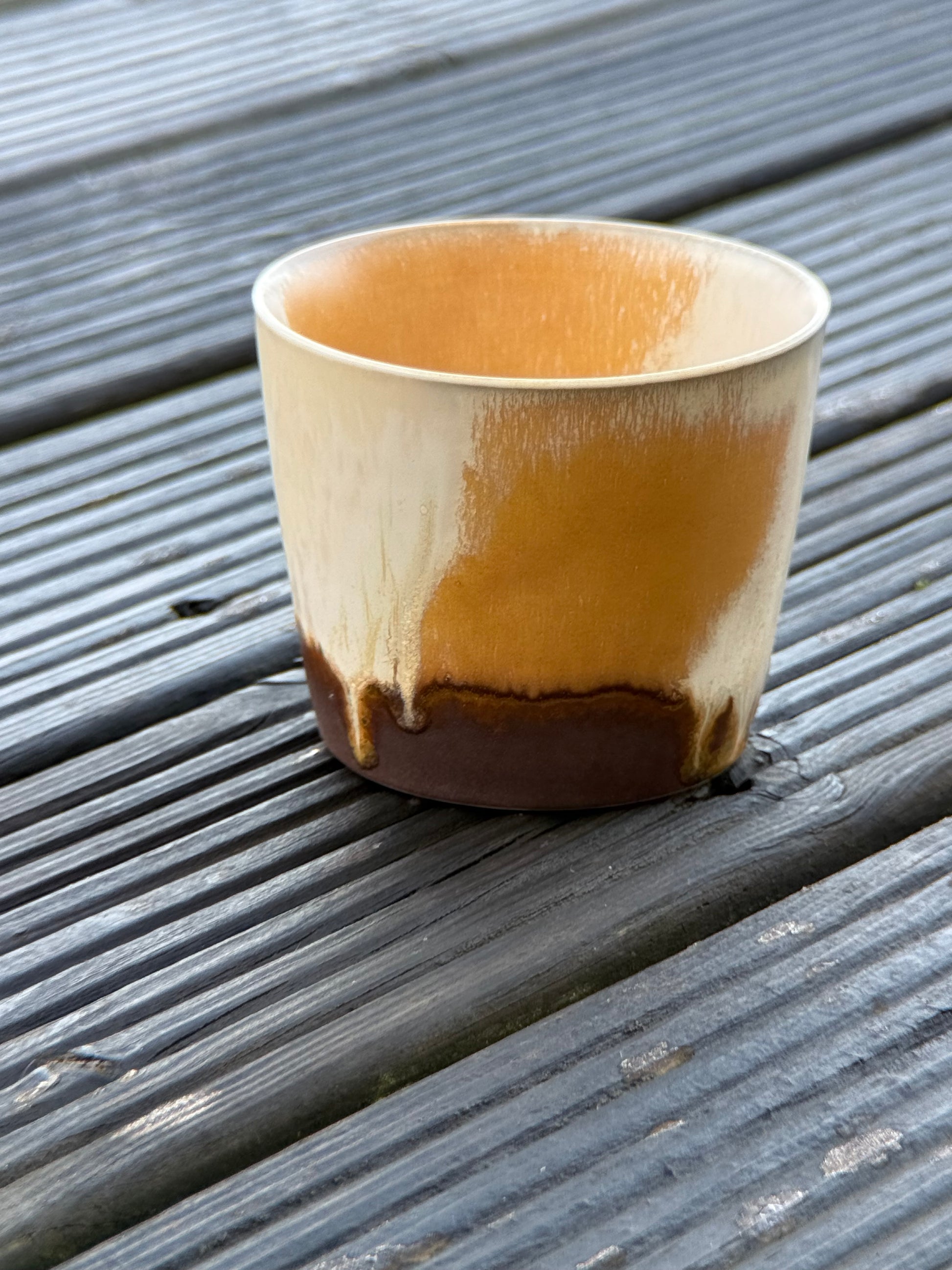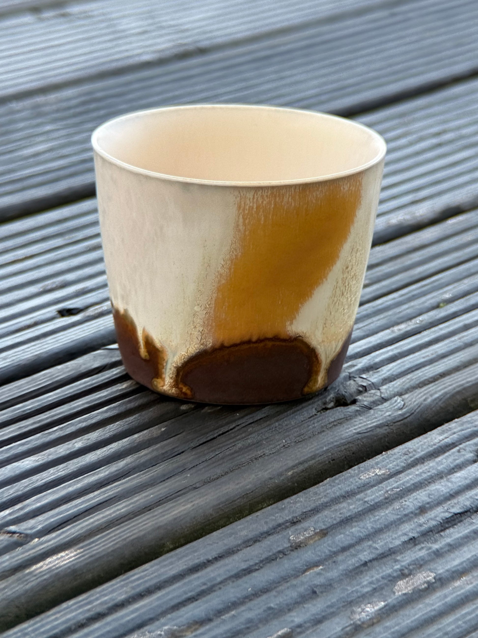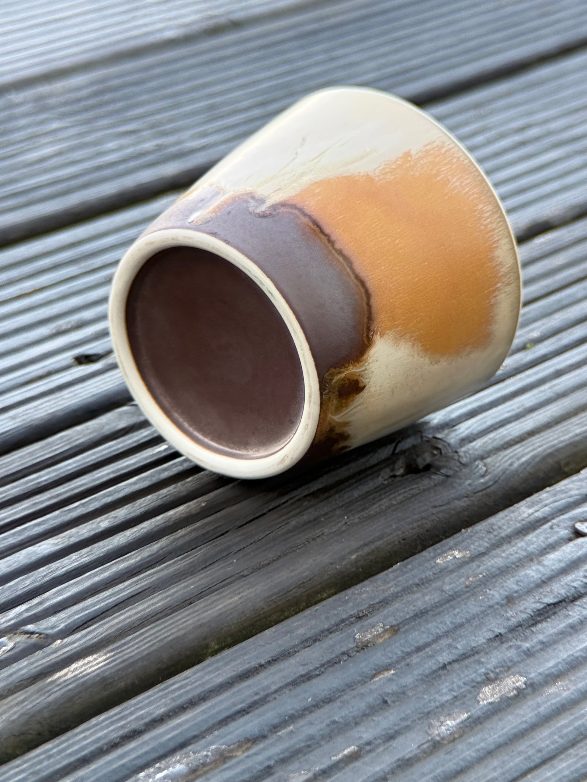 Ground yourself with the earthy elegance of the "Shoreline" cup. Inspired by the distinct layers where land meets the water, this piece showcases a beautiful horizontal stratification. A clean, off-white upper band gives way to a textured, sandy middle section, before grounding firmly into a rich, rusty-brown base. The defined bands of color provide a satisfying visual weight and a connection to the natural world.