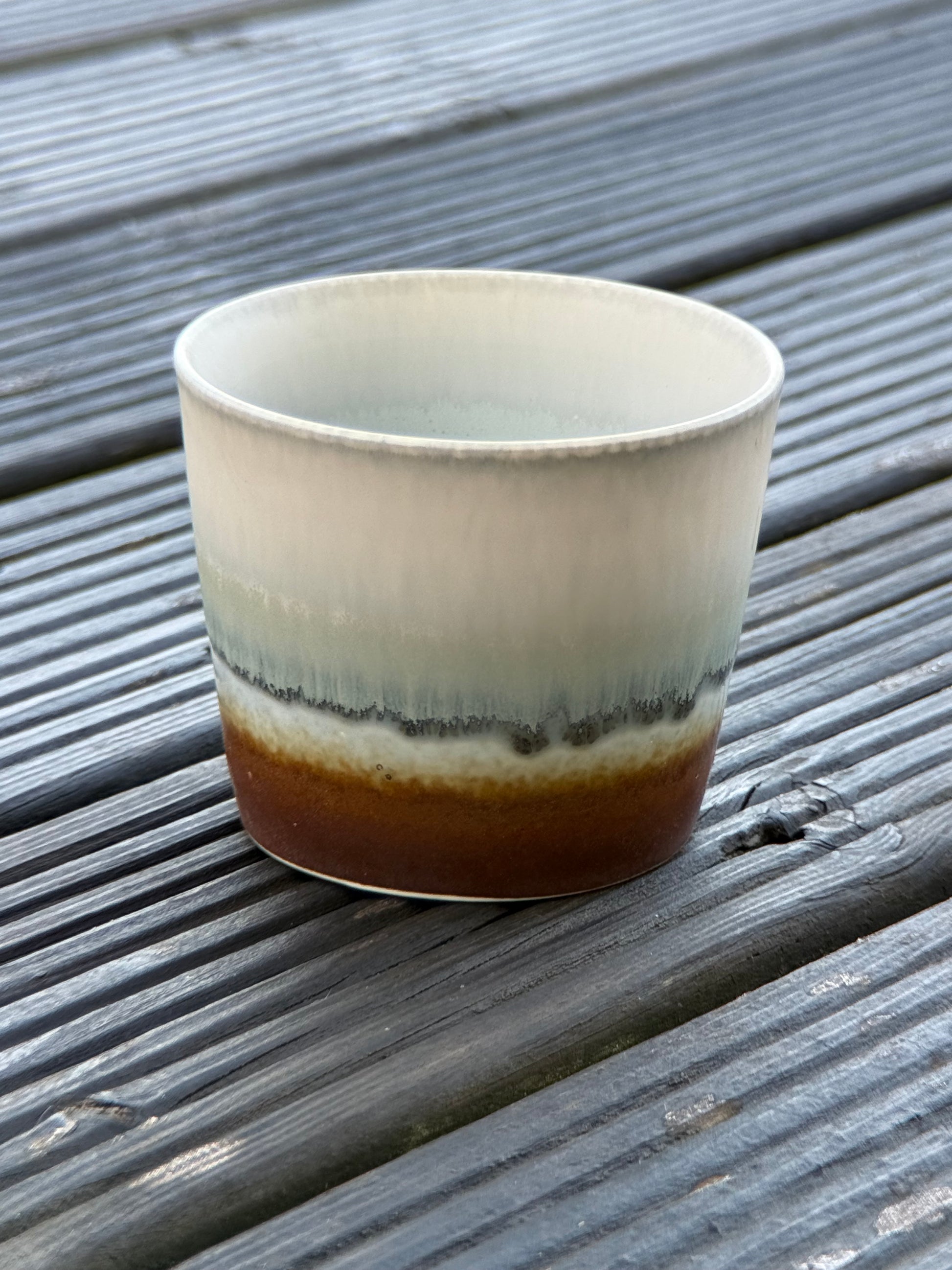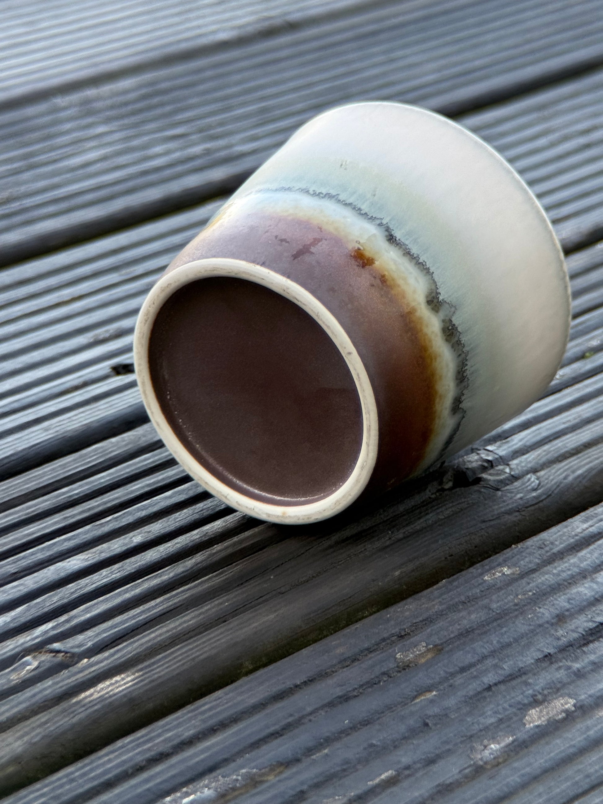 Embrace dynamic, organic texture with the "Windswept Dune" cup. This piece is defined by a sense of movement, featuring earthy brown glazes that sweep diagonally across a pale cream background, mimicking the patterns of sand shifted by coastal breezes. The resulting finish is rustic and highly textural, offering a unique, tactile experience that feels raw and untamed in the hand.